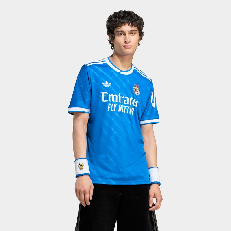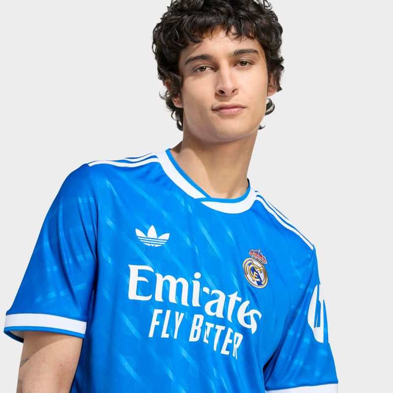 En casa, de azul. Esta tercera camiseta del Real Madrid viene en un tono que está muy cerca de los corazones de los madridistas y de los aficionados a las 3 Franjas. Un color clásico de adidas Originals y un sutil guiño a la identidad del Bernabéu, es el tono perfecto para celebrar la asociación futbolística por excelencia. Las 3 Franjas dentadas y el Trifolio añaden una herencia adidas adicional. AEROREADY, que controla la humedad, mantiene a los aficionados concentrados.